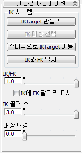 팔 다리 컨트롤은 팔 다리 애니메이션 롤아웃에 있습니다. 이 롤아웃은 설정 모드와 애니메이션 모드에서 모두 사용할 수 있습니다.