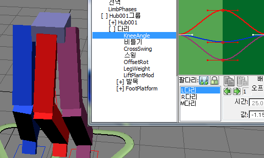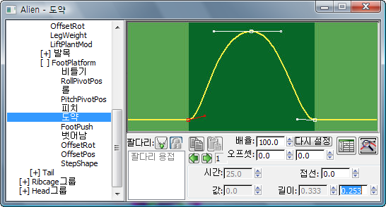 OffsetRot 및 OffsetPos를 제외한 모든 제어기에는 모션 주기 내에서 선택한 제어기의 모션에 대한 곡선을 표시하는 그래프가 있습니다.