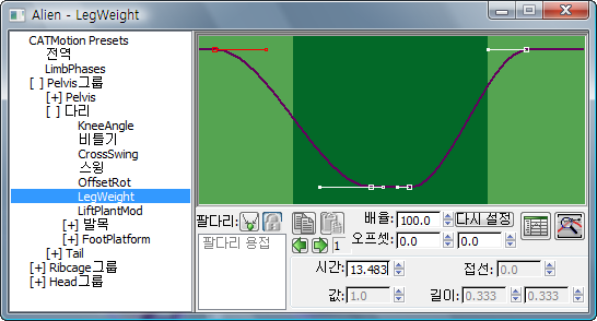 이동이 다소 부자연스러워 보이면 LegWeight 그래프를 스무딩해야 할 수 있습니다. 발이 도약할 때 발목이 너무 똑바로 이동하면 그래프에서 도약 부분의 LegWeight가 너무 긴 것일 수 있습니다.