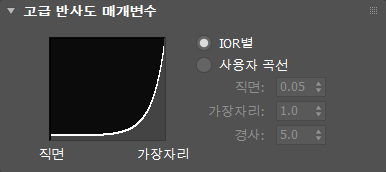 - 이 각도 의존 반사도는 수동으로 만든 사용자 정의 곡선을 기준으로 합니다. 이는 물리적으로 충분히 사실적이지는 않지만 더 많은 컨트롤을 제공합니다.