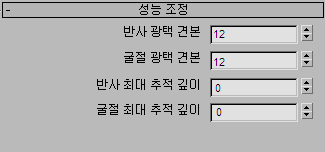 주: 반사 광택 샘플이 0이면 반사는 “완벽한 거울”의 형태를 취하고 실제 광택 값에 관계없이 오직 하나의 광선을 쏩니다. 이것을 이용해 반사가 매우 약한 표면에 대해 성능을 향상시킬 수 있습니다.