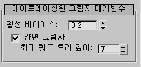 레이트레이싱된 그림자 매개변수 롤아웃은 사용자가 라이트에 대한 그림자 생성 기술로 레이트레이싱을 선택한 경우 나타납니다. 일반 매개변수 롤아웃에서 이 설정을 선택합니다.