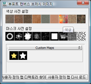 이 대화상자는 사전 설정 색상 브러시 행, 사전 설정 마스크 이미지 행, 자신의 이미지를 브러시 맵으로 사용할 수 있는 사용자 정의 맵 리스트, 그리고 맵 관리를 위한 버튼 두 개로 구성됩니다. 브러시 이미지 이름을 표시하려면 해당 축소판 위로 마우스를 이동합니다.