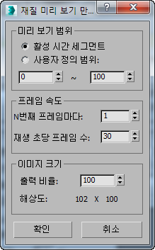 미리 보기 만들기를 클릭하여 애니메이션 재질을 미리 보면 재질 미리 보기 만들기 대화상자가 표시됩니다. 기본적으로 미리 보기는 _medit.avi라는 이름으로 ₩previews 하위 디렉토리에 저장됩니다. 다음에 미리 보기 만들기를 사용할 때 덮어쓰지 않도록 미리 보기 저장을 사용하여 미리 보기에 다른 이름을 지정할 수 있습니다.
