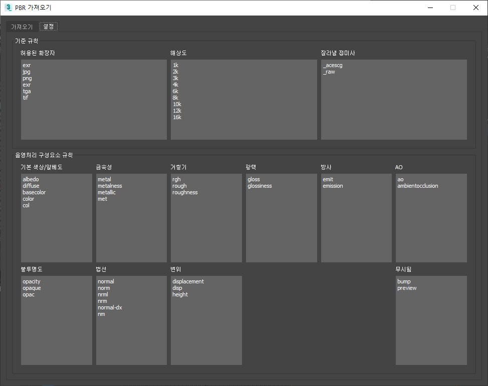 PBR 재질 가져오기 유틸리티를 사용하면 장면에 사용할 PBR 재질을 간편하게 생성할 수 있습니다.