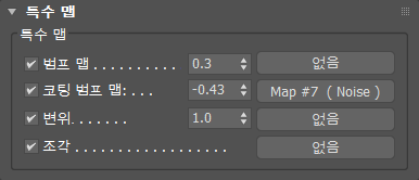 물리적 재질의 특수 맵 롤아웃을 사용하면 물리적 재질을 만들 때 특수 맵을 사용할 수 있습니다.