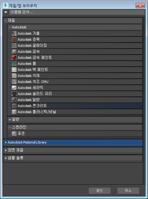 컴팩트 재질 편집기에서 유형 버튼이나 모든 맵 버튼을 클릭하면 재질/맵 브라우저의 모달 버전이 열립니다.