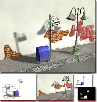 - 오브젝트 깊이 3D 방법입니다. 렌더러에서 먼저 그림자를 렌더링한 다음, 장면에 안개를 적용합니다. 이렇게 하면 3D 무광택 표면의 안개 양이 변경되므로 생성된 무광택/알파 채널이 배경에 완전하게 혼합되지 않습니다. 무광택 오브젝트가 2D 배경이 나타나는 장면의 3D 오브젝트일 경우 오브젝트 깊이에서를 사용하십시오.