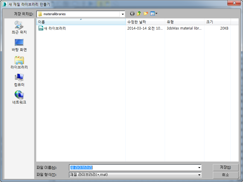 3ds Max에서 입력한 이름과 함께 MAT 파일로 라이브러리가 저장됩니다(예: New Library.mat). 라이브러리의 기본 위치는 현재 프로젝트의 \materiallibraries 폴더입니다. 프로젝트 폴더를 설정하지 않은 경우 <3ds Max 프로그램 폴더>\materiallibraries 폴더에 새 라이브러리가 저장됩니다.