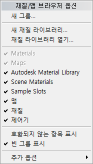 재질/맵 브라우저를 관리하는 데 사용되는 일반적인 옵션을 표시합니다.