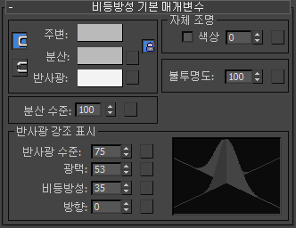 기본 매개변수 롤아웃의 두 번째 부분에는 어떤 면에서 여러 셰이더 간의 가장 큰 차이점인 반사광 강조 표시에 대한 제어가 있습니다. 자세한 내용은 다음 항목을 참조하십시오.