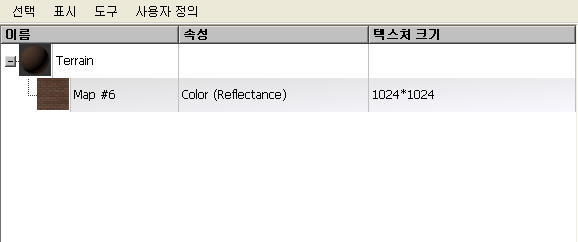 위쪽 장면 패널과 마찬가지로 아래쪽 재질 패널의 주요 부분은 맵과 재질 특성을 설명하는 열이 포함된 창입니다. 재질 탐색기에서는 이러한 열의 일부 특성을 편집할 수 있습니다. 재질 패널의 열은 장면 패널의 열과 다릅니다.