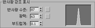 반사광 강조 표시 강도에 영향을 미칩니다. 값을 높일수록 강조 표시가 점점 밝아집니다. 기본값은 표준 재질의 경우 0, 레이트레이싱 재질의 경우 50입니다.