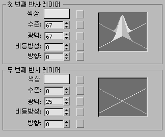 반사광 강조 표시의 강도에 영향을 미칩니다. 값을 높일수록 강조 표시가 점점 밝아집니다. 기본값: 첫 번째 레이어는 5, 두 번째 레이어는 0입니다.