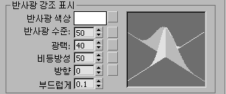 반사광 강조 표시 그룹의 나머지 제어는 이 롤아웃의 맨 위에 있는 "음영 처리:" 옆에 표시되는 활성 셰이더에 따라 다릅니다. 이 강조 표시 제어는 표준 재질 셰이더와 동일합니다.