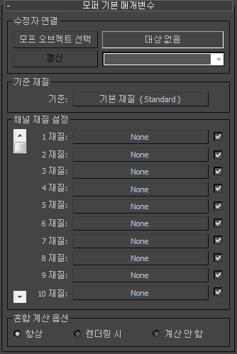 많은 활성 재질을 혼합하는 경우 3ds Max 속도가 저하될 수 있습니다. 이 그룹의 옵션을 사용하면 모프 결과 계산 시기를 제어할 수 있습니다.