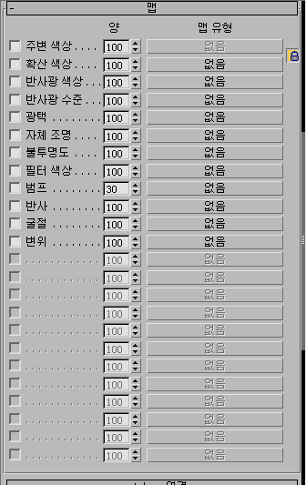 재질의 맵 롤아웃에서는 맵에 액세스하여 재질의 다양한 구성요소에 맵을 지정할 수 있습니다. 또한 각 맵에 대한 양 값(상대적 강도)을 설정할 수 있습니다.