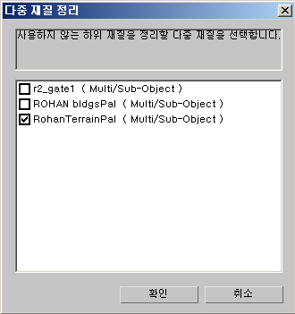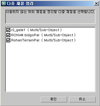 정리 대화상자는 할당되지 않은 하위 재질이 포함된 장면의 모든 다중/하위 오브젝트 재질 리스트를 제공합니다. 여기서 할당되지 않은 하위 재질을 제거할 재질을 선택할 수 있습니다.