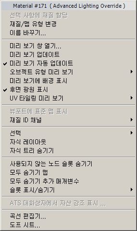 재질 또는 맵 노드를 마우스 오른쪽 버튼으로 클릭하면 재질 또는 맵을 표시하고 관리하기 위한 다양한 옵션이 들어 있는 메뉴가 표시됩니다.