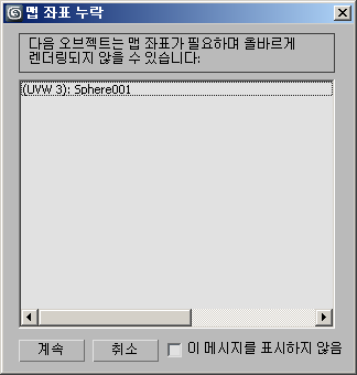 채널 1 이외의 맵 채널을 사용하는 맵을 가진 재질을 사용하여 하나 이상의 오브젝트를 렌더링하려고 시도할 때 맵 좌표 누락 대화상자가 표시됩니다. (채널 1 매핑 좌표는 오브젝트에 매핑된 재질을 할당할 때 자동으로 설정되므로 채널 1은 예외입니다.). 토글 선택된 뷰포트의 맵 표시를 가진 맵만 누락된 상태로 나열됩니다.