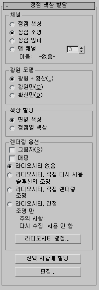 주: 비록 색상, 조명, 알파 채널은 특정한 이름이 있지만 사실 3ds Max는 여기에 어떤 종류의 데이터가 저장되어야 하는지 강제하지 않습니다. 세 채널 모두 4채널(RGBA) 정점 색상 데이터를 보유할 수 있습니다.