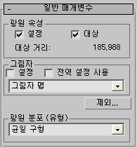 일반 매개변수 롤아웃을 통해 라이트에 대해 그림자 투사를 설정하거나 끄고 라이트에 사용할 그림자 유형을 선택할 수 있습니다.