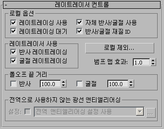 이 그룹의 제어를 사용하면 레이트레이싱된 맵과 재질의 전역 앤티앨리어싱 설정을 재지정할 수 있습니다. 앤티앨리어싱이 전역으로 꺼져 있으면 이 제어를 사용할 수 없습니다. 앤티앨리어싱을 전역으로 설정하려면 렌더링