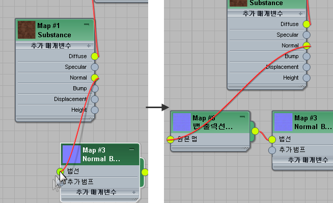 다시 와이어링을 수행하면 3ds Max에서 두 노드 사이에 맵 출력 선택기 노드를 자동으로 삽입합니다.