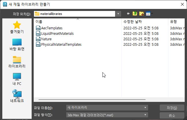3ds Max에 파일 대화상자가 열려 재질을 저장할 라이브러리(MAT 파일)를 선택할 수 있습니다.
