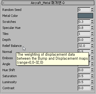 각 실체 텍스처에는 해당 매개변수 세트가 있습니다. 일부 매개변수는 임의 시드와 같이 대부분의 텍스처에 공통됩니다. 대부분의 매개변수는 위 그림과 같이 툴팁으로 이름과 간단한 설명을 제공합니다. 특별히 지정되지 않는 한 대부분의 매개변수에 대해 사용 가능한 값의 범위는 0.0 – 1.0입니다.