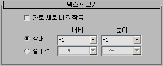 이러한 설정은 현재 텍스처의 출력 해상도에만 영향을 줍니다. 전역 크기(상대)의 현재 텍스처 해상도를 기본으로 하거나 전역 크기와 독립적으로 설정할 수 있습니다. 이 롤아웃을 사용하여 하나의 옵션을 선택하고 현재 개별 실체의 차원을 설정합니다. 텍스처 크기 설정이 높을수록 더 나은 모양의 텍스처가 생성되지만 렌더링 시간이 더 오래 걸립니다.
