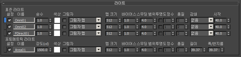 이 롤아웃은 구성 롤아웃에서 모든 라이트 또는 선택한 라이트가 활성화된 상태에서 볼 수 있습니다. 해당 컨트롤은 개별 라이트 오브젝트용입니다. 이 롤아웃은 표준 라이트 및 포토메트릭 라이트에 대한 리스트를 각각 표시합니다.