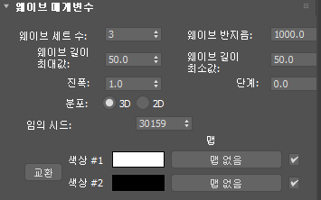 패턴에서 사용되는 웨이브 세트의 수를 지정합니다. 웨이브 세트는 오브젝트(2D 웨이브 분포의 경우 원형) 내의 가공의 구 표면을 따라 무작위로 계산된 지점에서 발생하는 방사상으로 대칭되는 웨이브의 그룹입니다. 잔잔한 물의 경우 이를 낮은 숫자로 설정하십시오. 물결이 거친 물의 경우 높은 숫자를 사용하십시오. 범위는 1에서 50 사이입니다. 기본값은 10입니다.