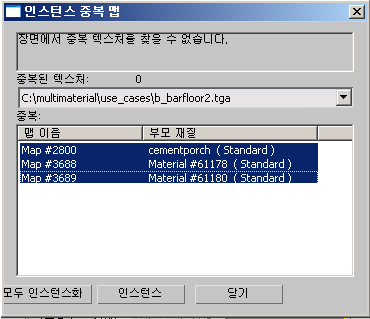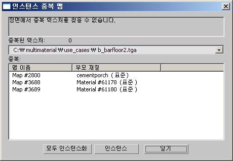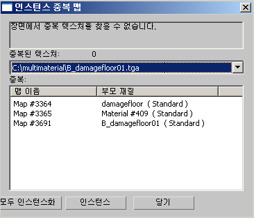 인스턴스 중복 맵 유틸리티는 전체 장면에서 중복되는 비트맵 맵이 있고 해당 맵을 인스턴스화하는 옵션을 제공하는 재질을 검색합니다. 장면에 동일한 텍스처 맵을 사용하는 여러 가지 재질이 있으면 인스턴스를 만들어 비디오 카드의 로드를 줄이고 뷰포트 성능을 향상시킬 수 있습니다.