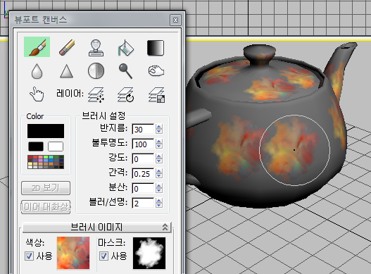 재질 및 맵을 설정하고 나면 필요한 경우 레이어 대화상자가 열리고, 마우스 커서는 활성 뷰포트 위에 놓는 경우 활성 도구의 아이콘(예: 페인트 및 지우기 도구의 경우 원형)이 됩니다. 페인트 도구를 사용할 때 커서를 페인팅할 오브젝트 위에 놓으면 브러시 아이콘 내에 페인트 이미지가 표시됩니다.