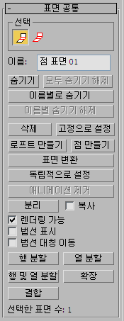이 항목에서는 점 표면, CV 표면 및 여러 종속 표면 유형에 공통적인 컨트롤에 대해 설명합니다. 표면 공통이라는 롤아웃에는 NURBS 표면에 대한 표면 하위 오브젝트 컨트롤이 포함되어 있습니다. 또 하나의 롤아웃인 재질 특성에서는 표면 하위 오브젝트에 대한 매핑을 제어합니다. 이 롤아웃은 별도의 항목에서 설명합니다. 해당 롤아웃에 대한 자세한 내용은 표면 근사화를 참조하십시오. 표면 하위 오브젝트에 대한 최종 롤아웃은 선택한 표면 유형에 따라 다릅니다.