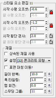 [시작/끝 최대 횡단 경사 잠금]시작 및 끝 값을 잠그거나 잠금 해제하려면 클릭합니다. 시작 최대 횡단 경사 또는 끝 최대 횡단 경사 값을 잠그면 수직 오프셋을 변경해도 이 값에 영향을 주지 않으며, 잠금 끄면 영향을 줍니다. 기본적으로 잠금 해제되어 있습니다. 이 옵션을 설정하면 스무딩 그룹을 제외한 재질 그룹의 다른 설정이 비활성화됩니다.