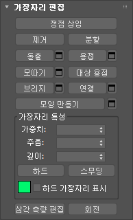 가장자리 하위 오브젝트 수준에서 단일 및 다중 가장자리를 선택하고 표준 방법을 사용하여 변환할 수 있습니다. 이 항목에서는 형상 편집 및 가장자리 편집 롤아웃을 다루며 다른 컨트롤에 대한 내용은 편집 가능한 폴리를 참조하십시오.