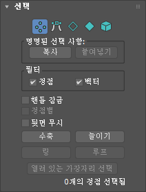선택 롤아웃은 이름을 갖는 선택과 함께 동작하면서 하위 오브젝트 수준의 선택, 화면 및 필터 설정을 위한 버튼을 제공하며 선택된 엔티티에 대한 정보를 보여줍니다.
