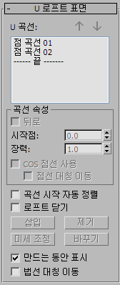 U 로프트 하위 오브젝트를 선택하면 U 로프트 매개변수가 수정 패널 아래쪽에 표시됩니다. 이 롤아웃은 하나의 U 로프트 하위 오브젝트가 선택될 경우에만 표시됩니다. 한 번에 둘 이상의 U 로프트를 편집할 수 없으며 일부 다른 NURBS 하위 오브젝트와 달리 이 롤아웃은 다중 U 로프트 하위 오브젝트를 선택한 경우 표시되지 않습니다.