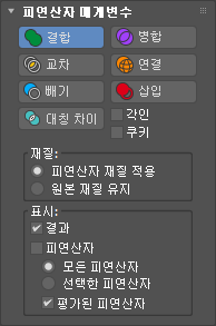 - 피연산자 매개변수 롤아웃에서 수행할 부울 연산(결합, 교차, 빼기, 병합, 연결 또는 삽입)을 선택하고 필요한 경우 각인 또는 쿠키 옵션을 활성화합니다.