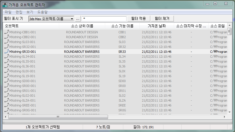 - 3ds Max 오브젝트 이름 전체 또는 일부 3ds Max 오브젝트 이름 마스크와 일치하는 오브젝트만 나열합니다.