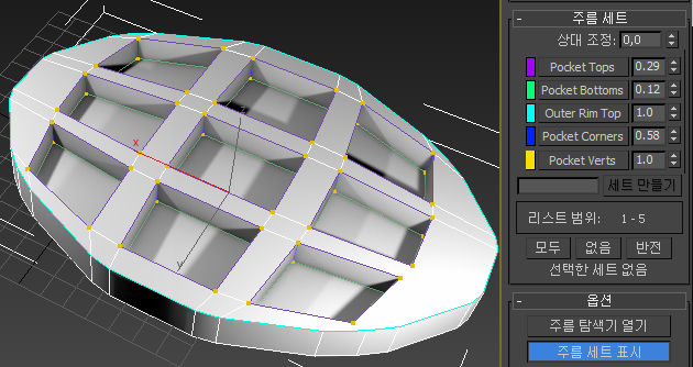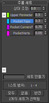 정점 또는 가장자리를 선택할 때마다 주름 세트로 저장할 수 있습니다. 이 롤아웃은 주름 세트를 관리하고 해당 값을 조정하기 위한 컨트롤을 제공합니다.
