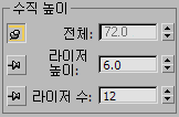 3ds Max는 다른 두 옵션을 조정하는 동안 수직 높이 옵션 하나를 잠근 상태로 유지합니다. 옵션을 잠그려면 누름 핀을 클릭합니다. 옵션의 잠금을 해제하려면 올라온 누름 핀을 클릭합니다. 3ds Max에서는 누름 핀을 누르면 매개변수의 스피너 값을 잠그고, 누름 핀을 놓으면 매개변수의 스피너 값을 허용합니다.