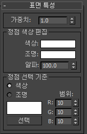 선택한 라디오 버튼에 따라 정점 색상 또는 조명 값이 색상 견본과 일치하거나 RGB 스피너에서 지정한 범위 안에 있는 모든 정점을 선택합니다.