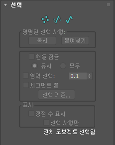 다양한 하위 오브젝트 모드 설정 및 해제, 명명된 선택 및 핸들 작업, 표시 설정 및 선택 개체 관련 정보에 대한 컨트롤을 제공합니다.