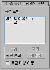 다중 곡선 트리밍 하위 오브젝트를 선택하면 다중 곡선 트리밍 매개변수가 있는 롤아웃이 나타납니다. 이 롤아웃은 하나의 다중 곡선 트리밍 하위 오브젝트를 선택할 때만 나타납니다. 한 번에 둘 이상의 여러 곡선 트리밍 오브젝트를 편집할 수 없으므로 다른 NURBS 하위 오브젝트와 달리 여러 곡선 트리밍 하위 오브젝트를 여러 개 선택하면 롤아웃이 나타나지 않습니다.