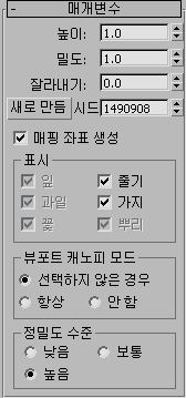 높이, 밀도, 가지치기, 시드, 캐노피 표시 및 정밀도 수준을 제어합니다. 시드 옵션은 동일한 종이 다르게 표시되도록 제어합니다. 동일한 종을 수백만 개로 다르게 생성할 수 있으므로 각 오브젝트가 고유할 수 있습니다. 뷰포트 캐노피 모드 옵션을 사용하면 3ds Max에서 식물을 표시하는 데 사용되는 정점과 면의 수를 줄임으로써 식물 정밀도를 제어할 수 있습니다.
