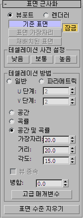 표면 근사화 롤아웃은 렌더링 및 뷰포트 표시를 위해 NURBS 모델의 표면 하위 오브젝트 근사값이 계산되는 방법을 제어합니다. 뷰포트와 렌더러에서 다른 방식으로 NURBS 근사값을 계산할 수 있습니다. 일반적으로 렌더링된 표시를 부드럽고, 정확하고, "사실적"으로 만드는 동시에 뷰포트를 명확하고 빠르게 표시하려고 합니다. 그러나 뷰포트에 대해 선택한 근사값은 메시를 만들며, 선택한 메시 종류가 나중에 NURBS 모델에 적용할 수정자의 동작에 영향을 줄 수 있습니다.