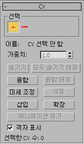 이 항목에서는 곡선에 있는 CV 하위 오브젝트에 대한 컨트롤을 설명합니다. CV라는 롤아웃에는 NURBS 모델에 대한 CV 하위 오브젝트 컨트롤이 포함되어 있습니다. 곡선 CV 하위 오브젝트 수준에서는 여기서 설명하는 CV 롤아웃 외에 소프트 선택 롤아웃도 표시합니다.